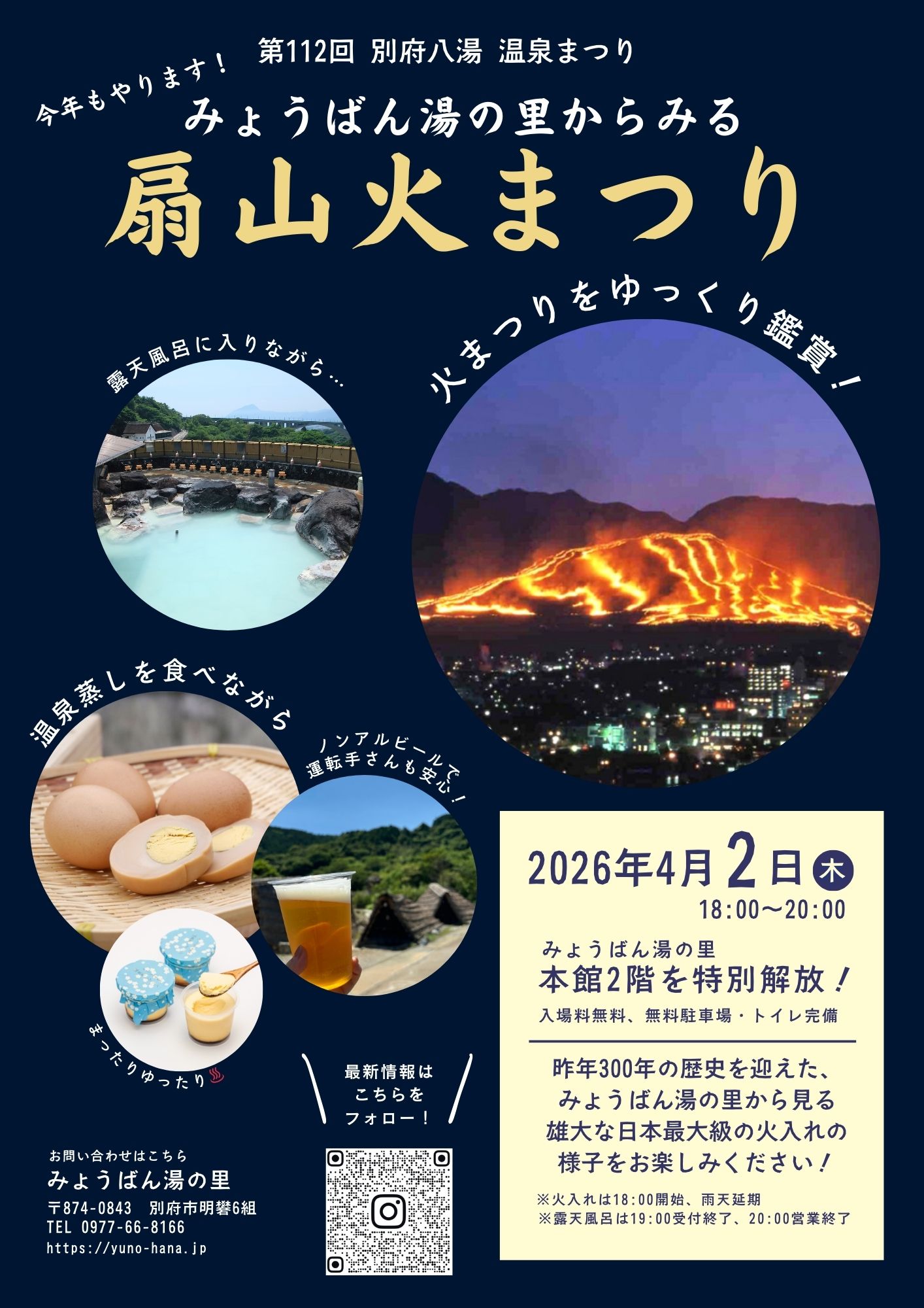 平素より、みょうばん湯の里をご愛顧いただき誠にありがとうございます。 別府市では令和8年4月1日(水)から5日(日)までの5日間、 温泉のめぐみに感謝するための「別府八湯温泉祭り」が今年も開催されます! 2日目に行われる、春の到来を告げる「扇山火まつり」。 その火入れの様子をゆっくり鑑賞していただけるよう、 火入れ開始予定の18:00から20:00まで、 みょうばん湯の里の一部エリアを一般開放いたします! また、温泉蒸したまごやプリンなどの販売も19:30まで行う予定です。 ぜひ、みょうばん湯の里で 雄大な湯けむりや湯の花小屋の雄大な景色とともに 日本最大級の火入れをご鑑賞ください! 日時:令和8年4月2日(木) 18:00(火入れ予定時刻)~20:00 開放場所:みょうばん湯の里 本館2階と屋外エリア (無料駐車場・トイレ完備) ※湯庵のみ19:30まで営業、ほか店舗は通常通り18:00に閉店いたします ※20:00までの開放となりますので、それ以降の駐車はご遠慮ください ※館内は全面禁煙のため、喫煙所はございません![]()